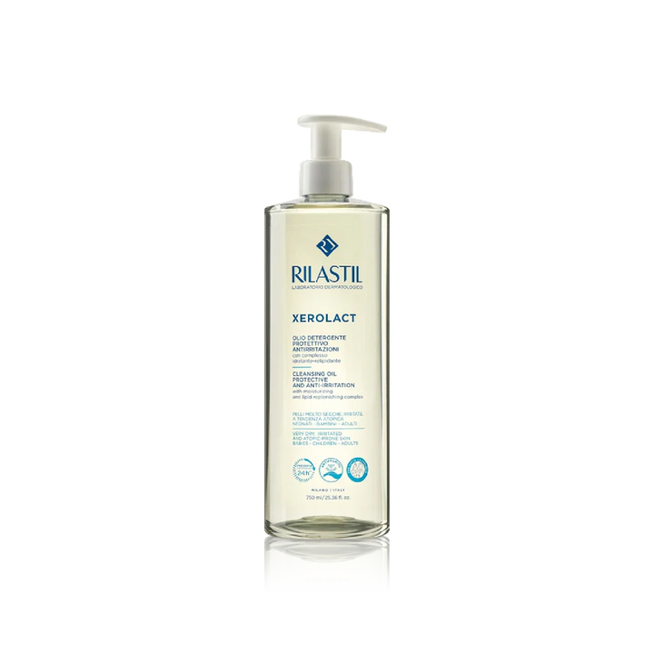 Rilastil Xerolact Cleansing Oil is a moisturizing, protective, and soothing cleansing oil formulated for dry, sensitive, and atopic-prone skin. Suitable for newborns, children, and adults, it gently cleanses while restoring the skin’s natural barrier and providing long-lasting hydration.