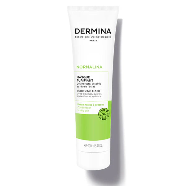 Dermina Purifying Mask unclogs pores and clarifies complexion. The association of Zinc Sulfate and Seaweed extract rebalances sebum secretion at the surface of the skin. The immediate astringent effect of the Phyto-active Complex tightens the pores. Finally, Kaolin absorbs sebum and impurities thus bringing radiance. The skin is purified, radiant and soft.
