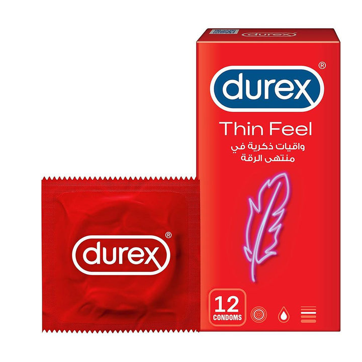 Durex Thin Feel condoms are crafted for increased sensitivity while maintaining the trusted protection of classic Durex condoms. They are made from high-quality natural rubber latex with a nominal width of 56mm and length of 205mm, featuring an easy-on shape with a teat end for a comfortable and secure fit. These condoms are pre-lubricated with silicone lubricant for a smoother experience and designed to have reduced latex smell for enhanced comfort.